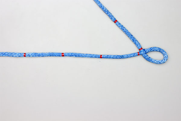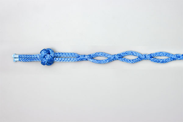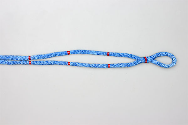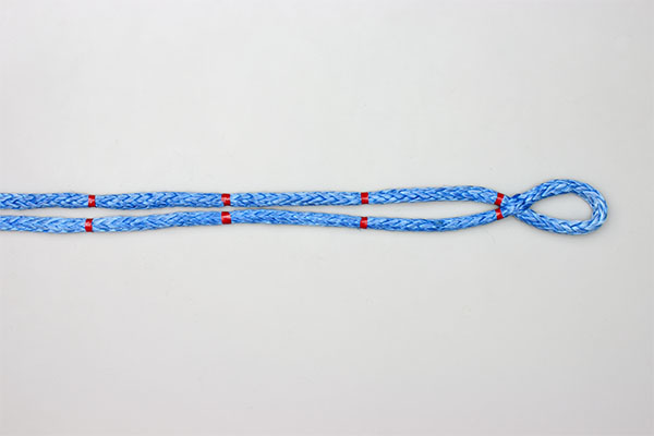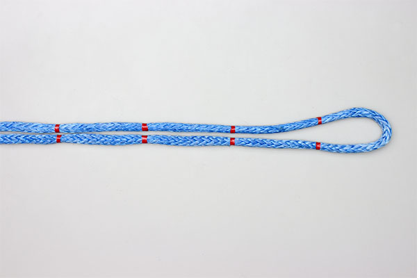 Origin: Matthew Otto of the Rig Loft developed the Button Sling. It is tied using 12-strand braided rope typically about 1/2" (12mm) in diameter. However, Otto uses a range of diameters and materials ranging from Dyneema 1.25" or 30mm (rated breaking strain of the sling about 17,000 lbs or 750 kN) down to Polyester 3/8" or 9mm (rated breaking strain about 800 lbs or 3.5 kN). He also uses a blend of Dyneema and Polyester.