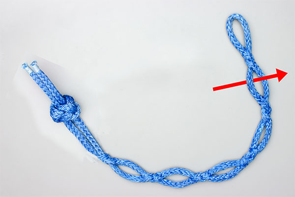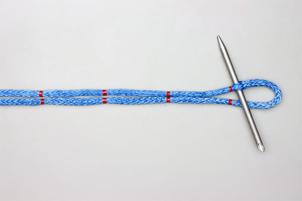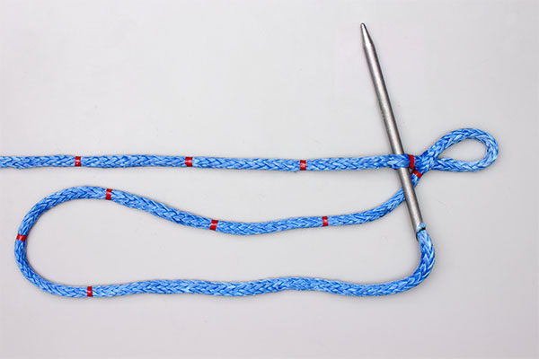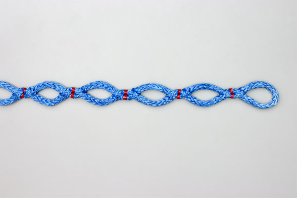 Mark the rope and pass the ends through each other to create a locked Brummel Splice. Repeat along the rope's length to create the holes. Tie a Diamond Knot in the end. Pass the Diamond knot through a selected hole to make the Sling.