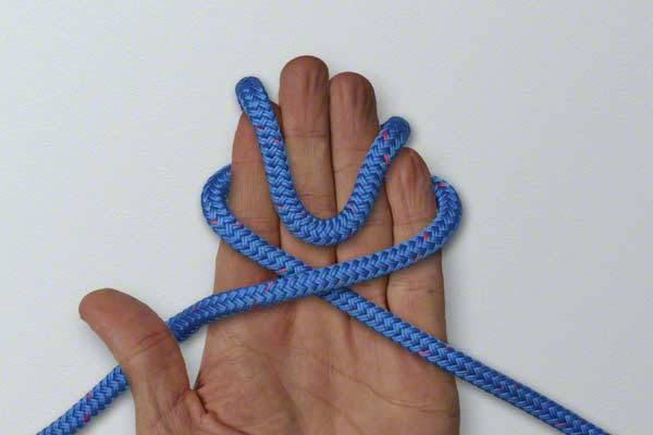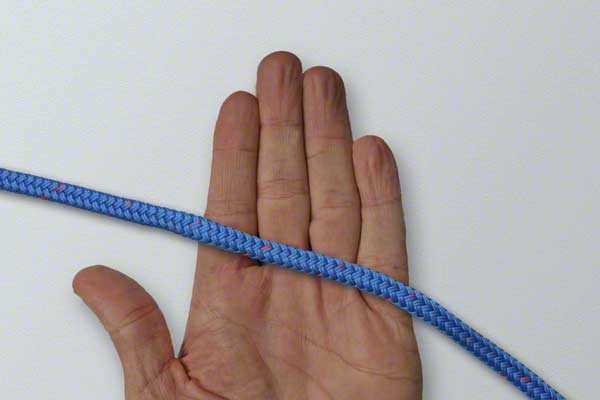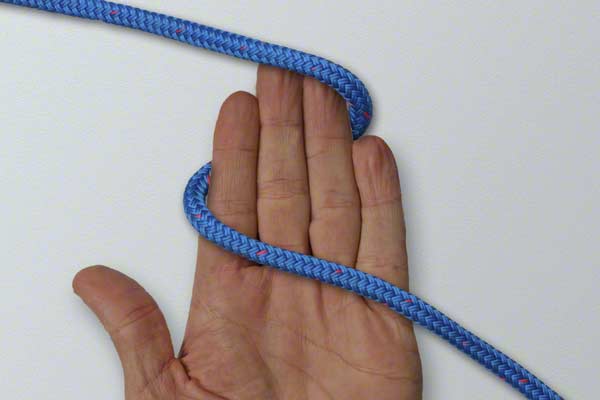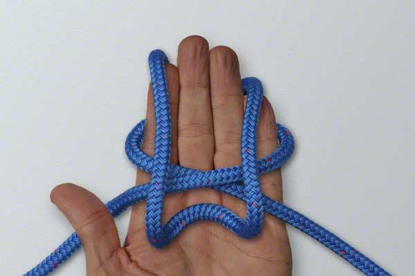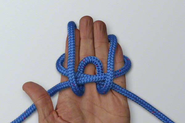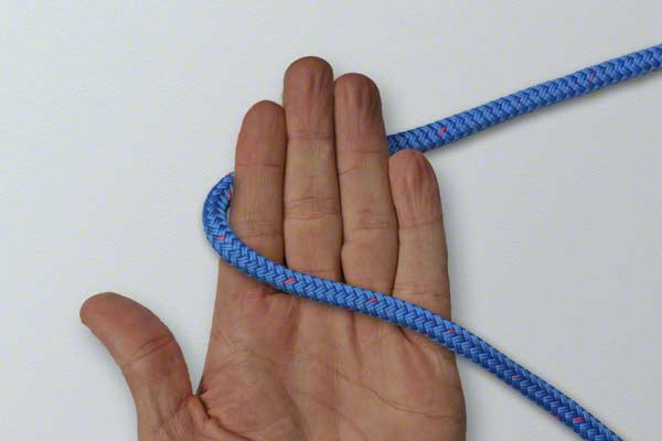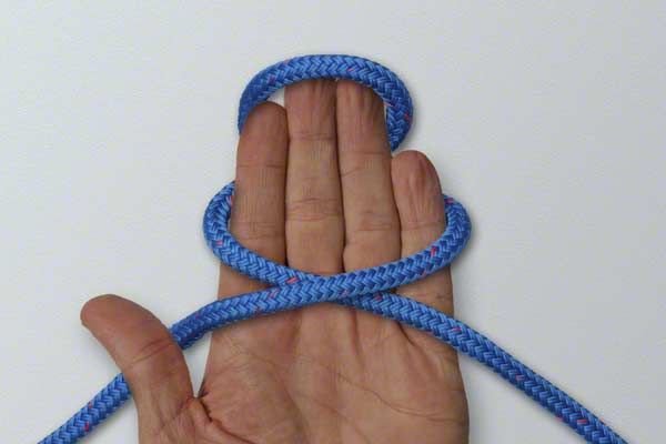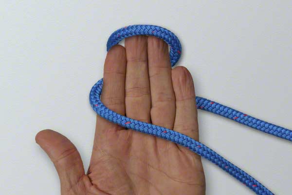 Wrap the rope around your hand twice. At the end of turn one, position the rope close to your fingertips. Continue around and complete turn two back near your thumb. Pick up the turn near your fingertips. Wrap it around the other two turns. Slide the knot off your hand and tighten by pulling on the loop and the ends.