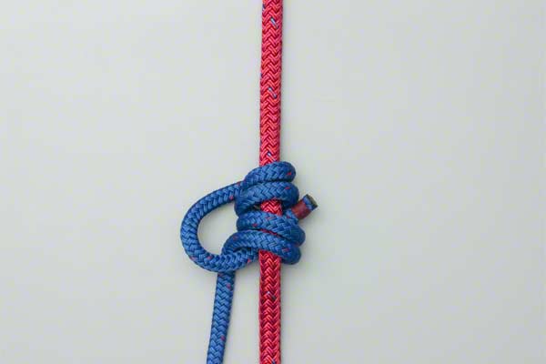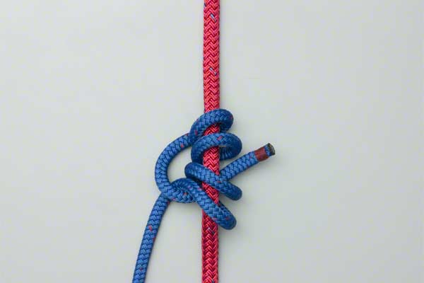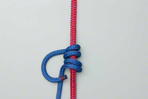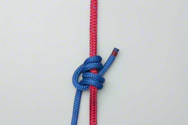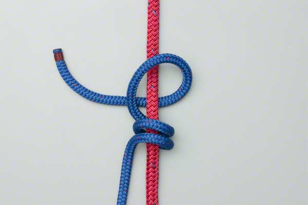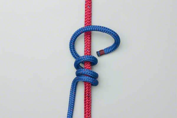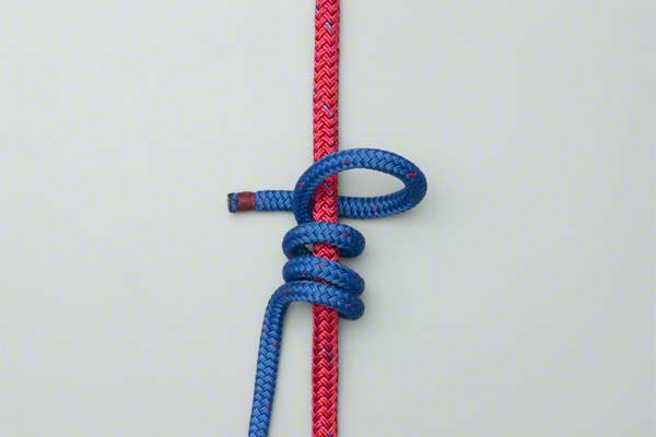 Wrap the end of the line four times around the climbing rope. Bring the end back down, around itself, and tuck it behind the climbing rope and under the first two turns so that it exits in the middle. Tighten to achieve a tight, neat, knot.
