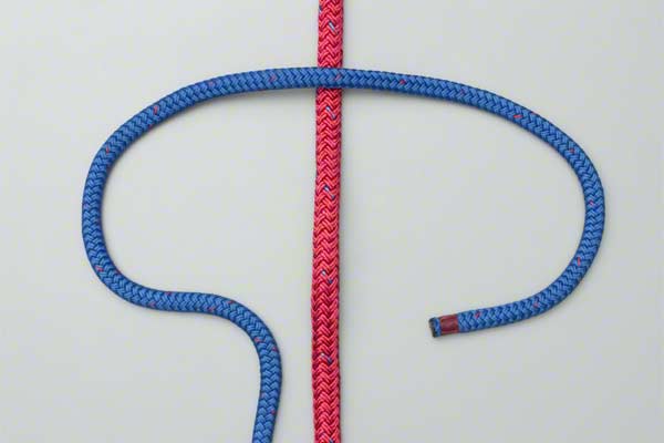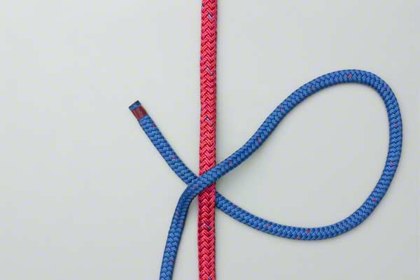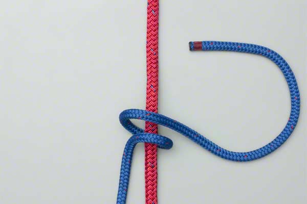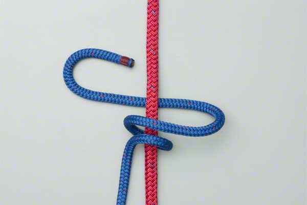 Tying It: In practice it is an advantage to wind the first two turns while your thumb is inserted up alongside the climbing rope. This maintains a pathway to make it easier to thread the line. Note: This final threading must pass behind the main rope as shown.