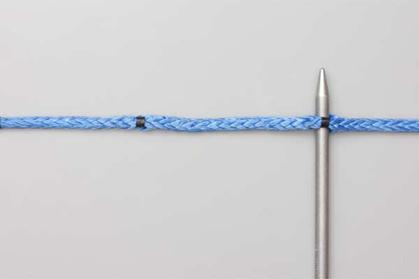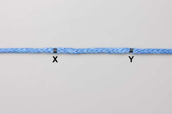 Measure: Mark the length of the long buried end by measuring off 72 diameters of the rope, e.g., 3 feet for a half-inch rope. Then measure off the length required for the final eye plus 3 rope diameters and make a second mark. Note: this additional length is necessary because the splice consumes some of this measured length.