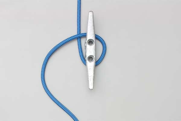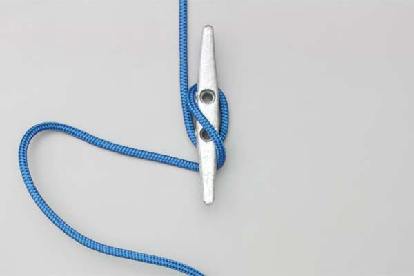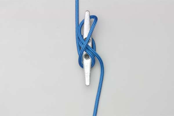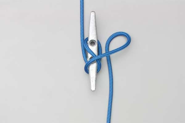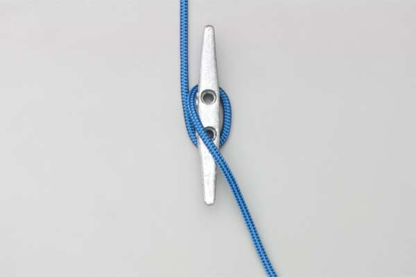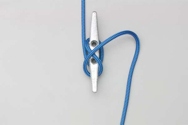 Pass the rope around the bottom horn and on around over the top. Continue down across the middle, and then up across again. Twist a loop in the rope and hook it on the cleat as a Half Hitch.
