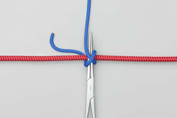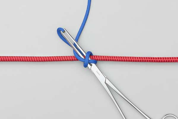Pass the suture twice around the vessel so that the second turn crosses over the first. Insert the forceps under the cross-over. Reach over the long end to retrieve the short end. Grip it, pull tight, and cut the ends.
