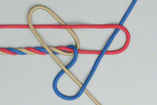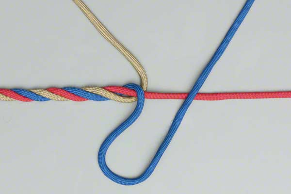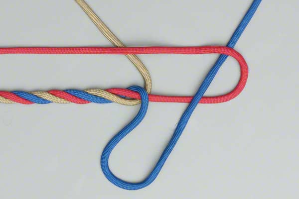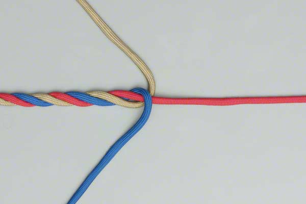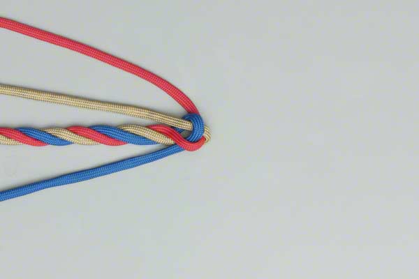 Spread out the strands. Choose one strand and, continuing around in the direction of the rope's twist, lay it across its neighbor. Repeat with that strand. Repeat with the remaining strand tucking it under the first. Tighen it to form the first part of a Back Splice.