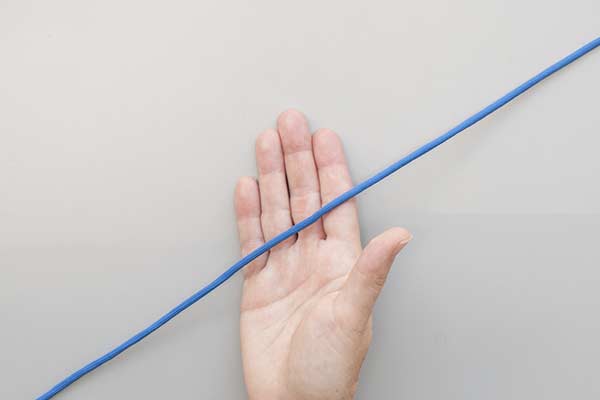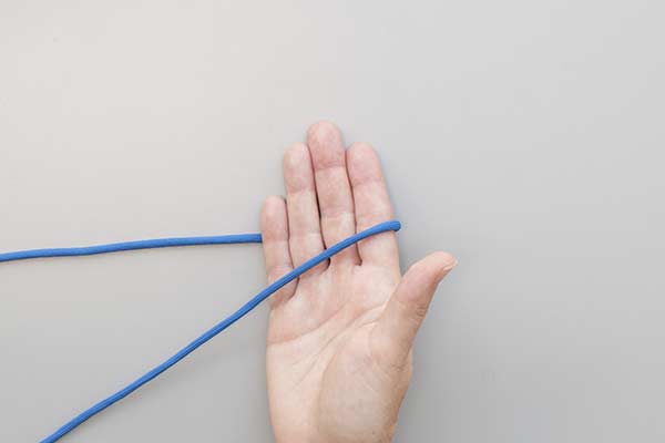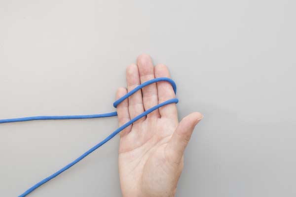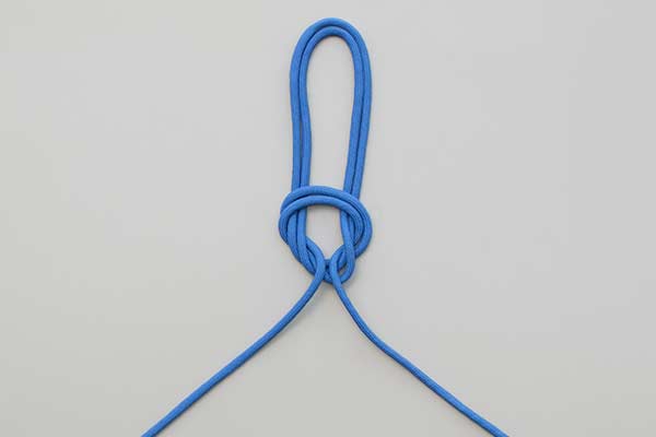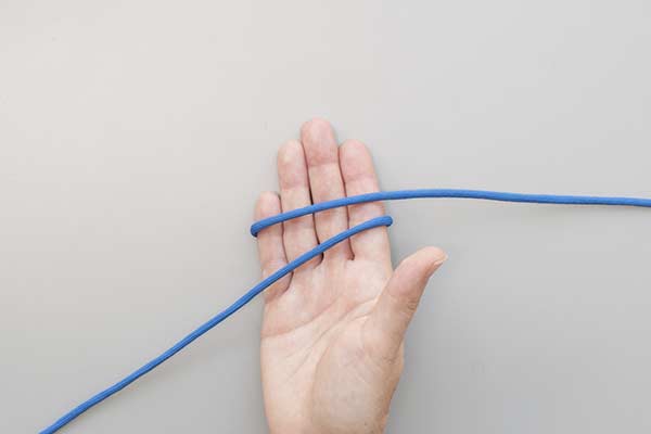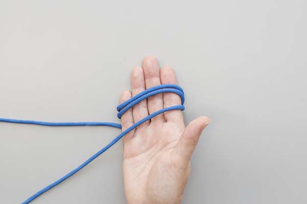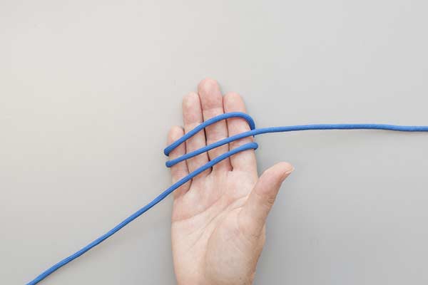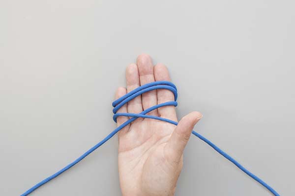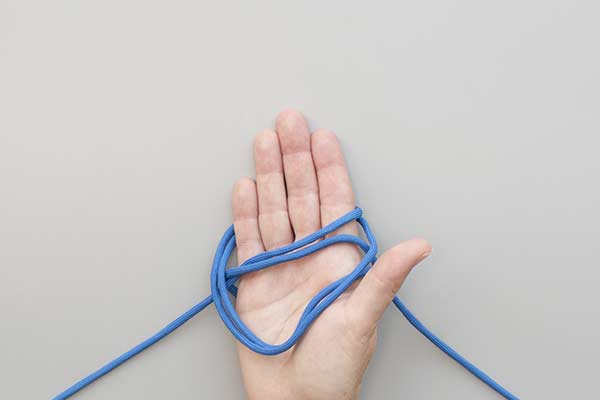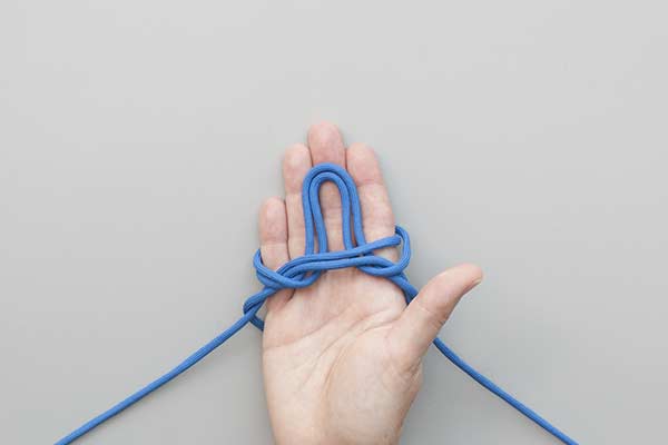 Wrap the rope across your palm four times. Position turns two and three near your fingertips. Complete turn four back near your thumb. Pick up the two turns near your fingertips and loosen them. Insert them up under the other two turns. Slide the knot off your hand and tighten by pulling on the loops and the ends.