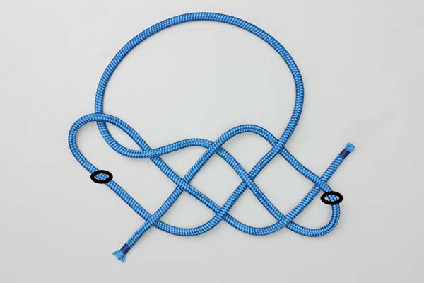 Different Ends: When completed a ring of diamond lacing apparently surrounds four strands passing through the ring's center. At the "Tight" end of this ring the four emerging strands are tightly embraced together; at the "Loose" end each strand emerges under a separate turn. In the Animation, the Tight end will surround the pair of loops. However, for a halter, the reverse orientation is preferred with the Tight end embracing the large loop and the ends because this reduces the tendency for the strain to open up the knot.