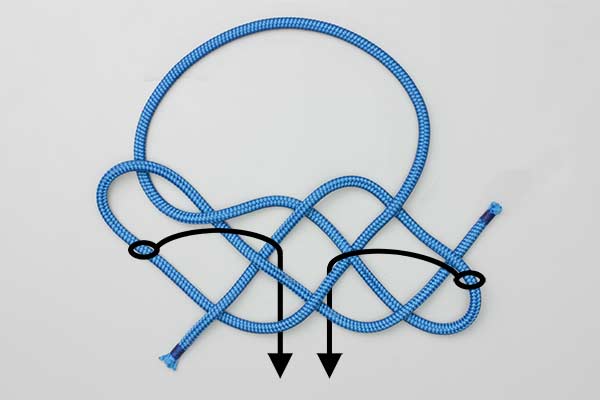 Choices: The animation shows the outermost part of each loop being pulled "down" through the central diamond. However, the version preferred for a halter is produced by instead passing the two ends and the large top loop "up" through the diamond. Warning: passing the loops "up" or the ends and large loop "down" only produces a mess.