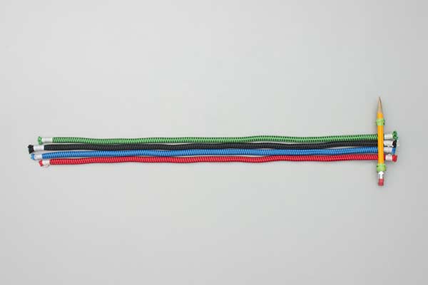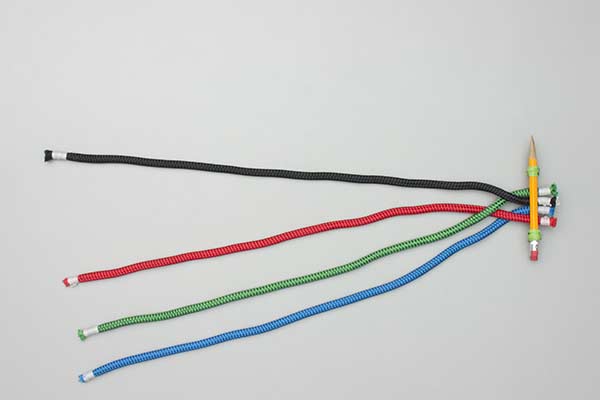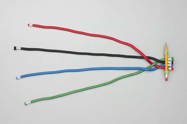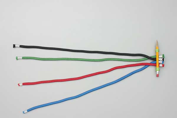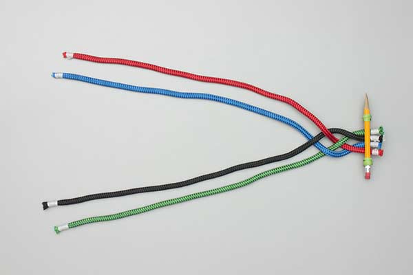 Starting the Sinnet: For this demonstration four cords, were clamped together as Ashley suggests using a pair of pencils either side of the strands with rubber bands at each end to provide the pressure.