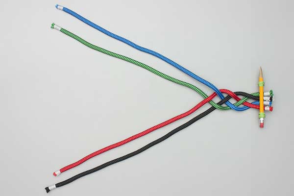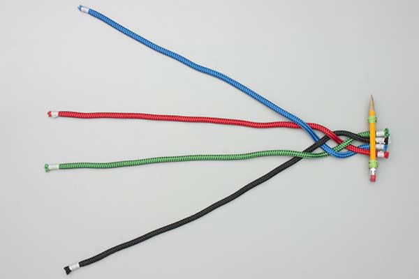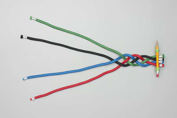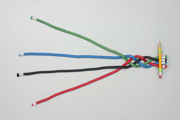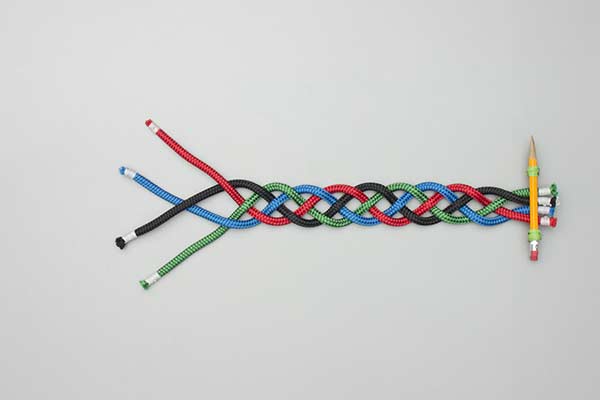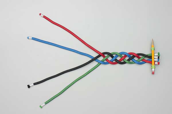 Start with the ends clamped together. Pass each strand alternately over and under its neighbor. Maintain even spacing and symmetry with spacing between the strands. If necessary rotate each strand to keep the sinnet lying flat. Continue until the desired length is reached.