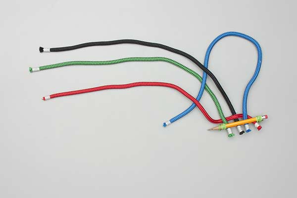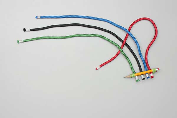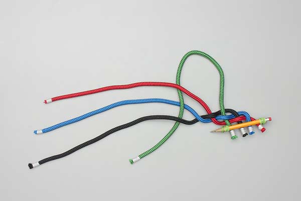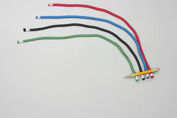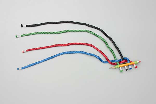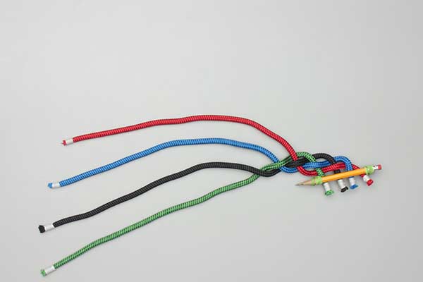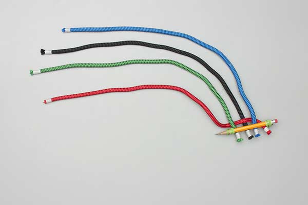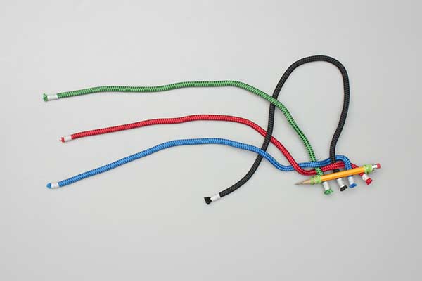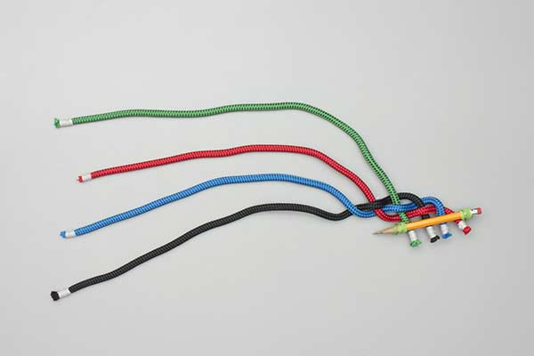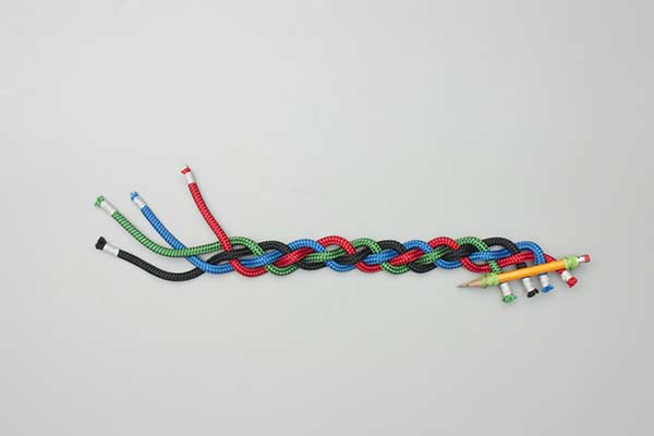 Starting the Sinnet: For this demonstration four colors were clamped together as Ashley suggests using a pair of pencils either side of the strands with rubber bands at each end to provide the pressure.