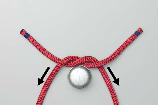 Cross the two ends over each other. Pass one end over and then under the other to make the Half Knot - which takes the load (arrows) in both ropes.