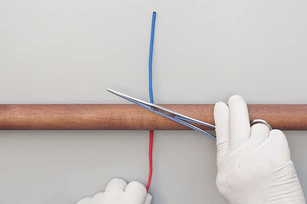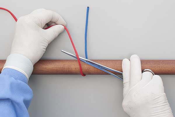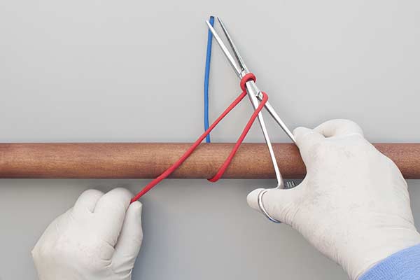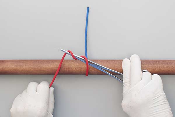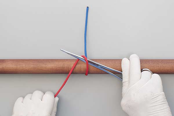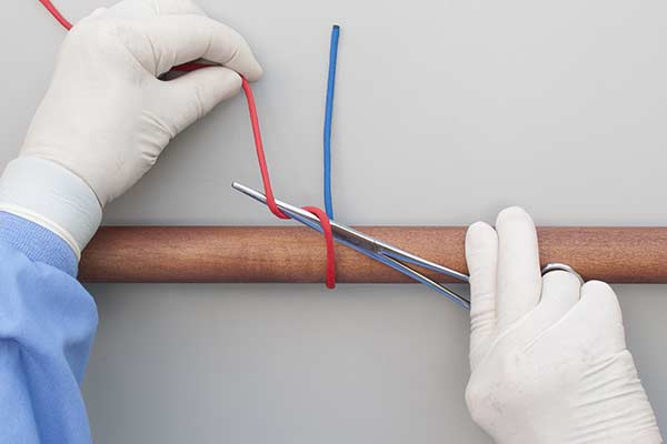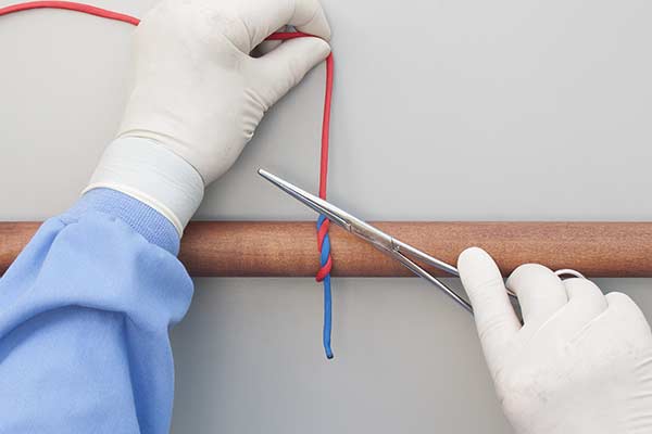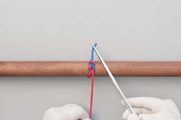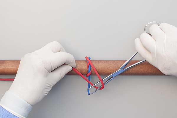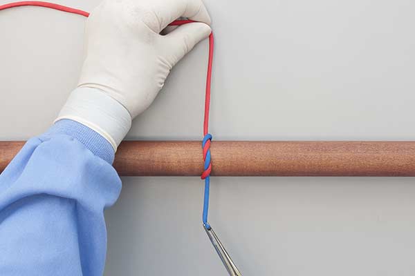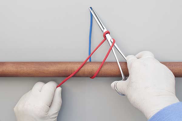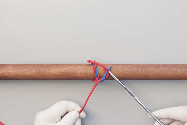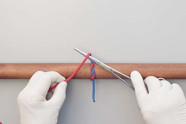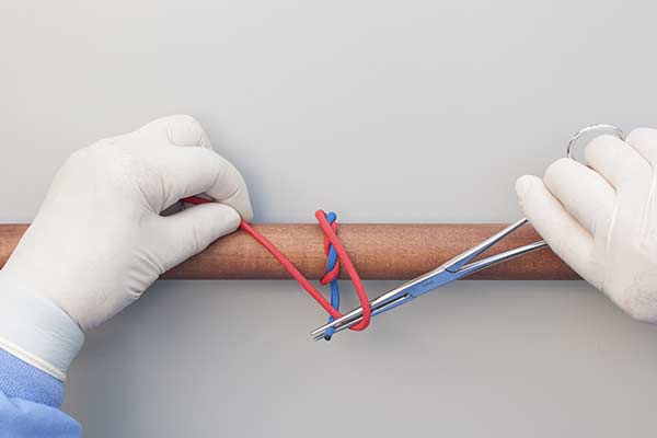 With the short end away from you, position the forceps. Wrap the long end over, under, over, and then under the forceps. Pick up the end and pull tight to make the Double Throw Knot. Position the forceps again and wrap the long end across them. Pick up the short end. Pull tight to complete the Ligature.