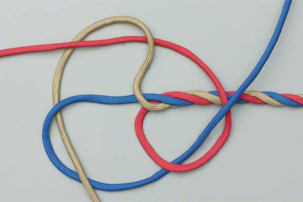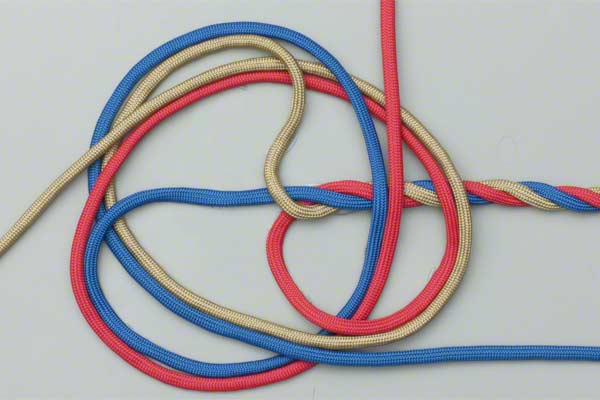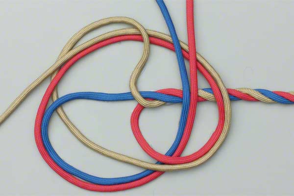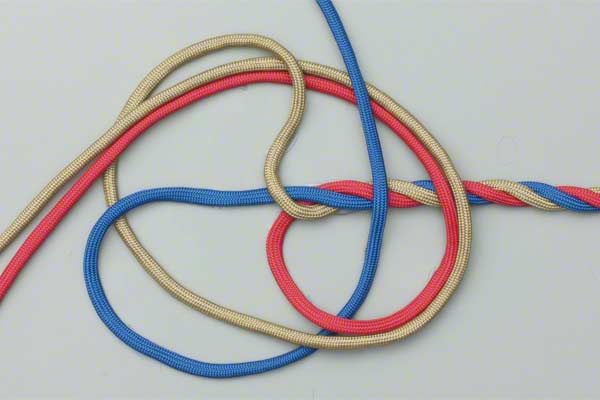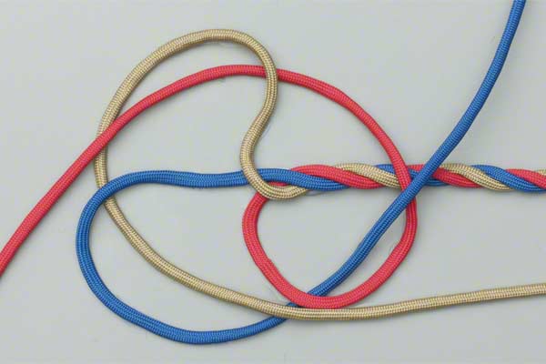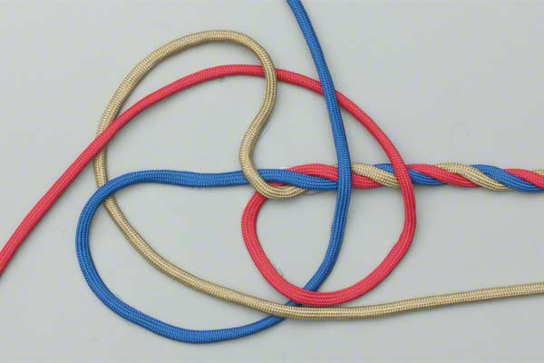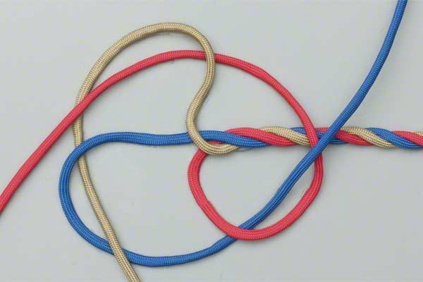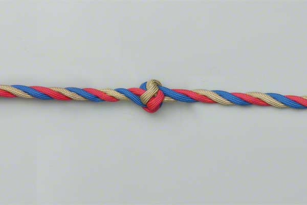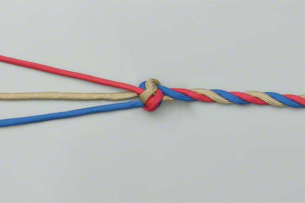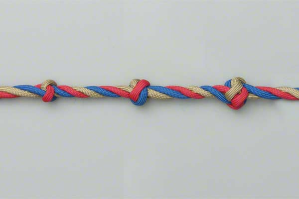 Start with a Wall Knot. Position each strand near the one to follow. Gold follows red under blue and up through itself. Red follows blue under gold and up through itself. Blue follows gold under red and up through itself. Tighten carefully and re-lay the rope.