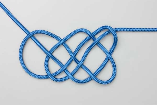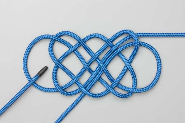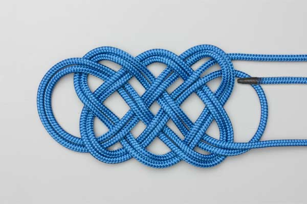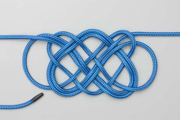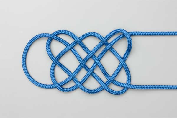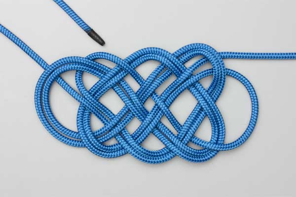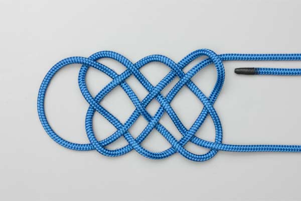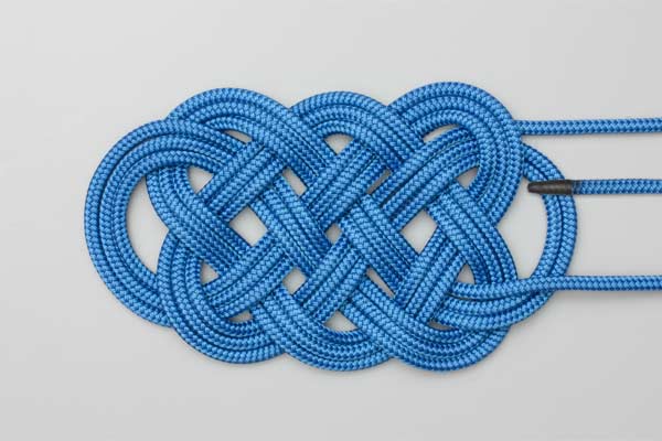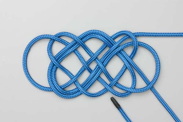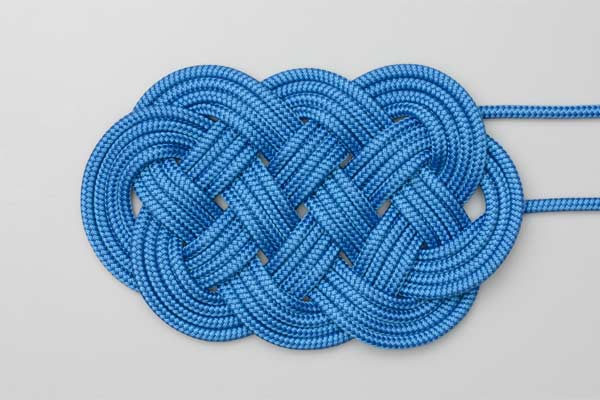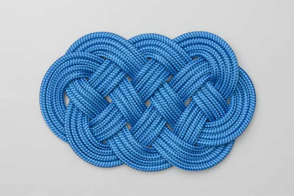 Origin: The Ocean Plait Mat (ABOK # 2243, p. 362) is a member of a large family of symmetrical mats made by weaving the ends. Each mat starts with an Overhand knot and can be lengthened merely be using longer loops and crossing them over each other again.