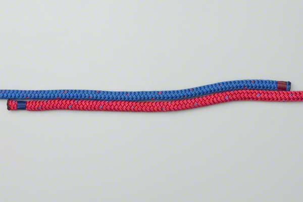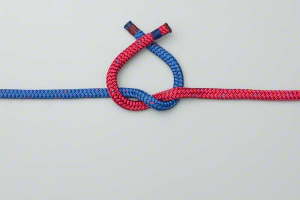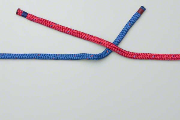 Take two ropes and cross them (red over blue) to form a half knot. Cross them a second time (red over blue again) and pull the ends tight to form the Square Knot.
