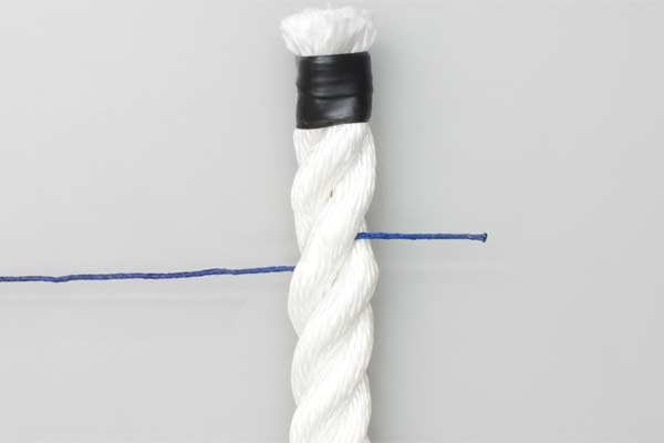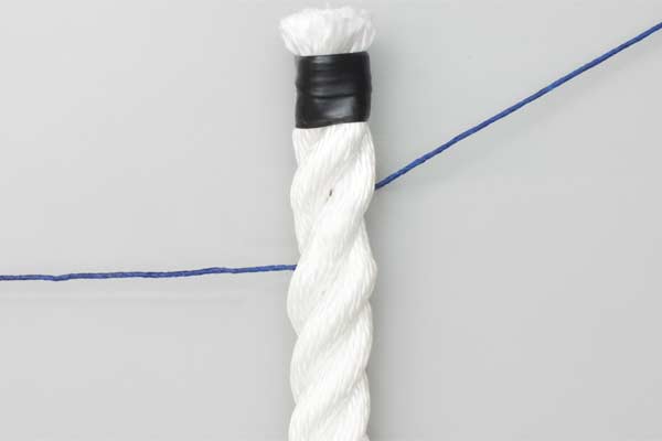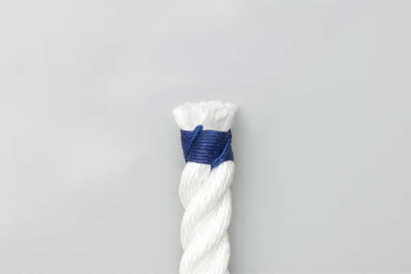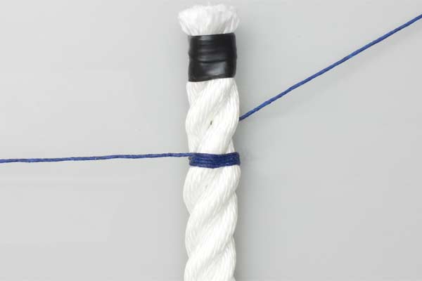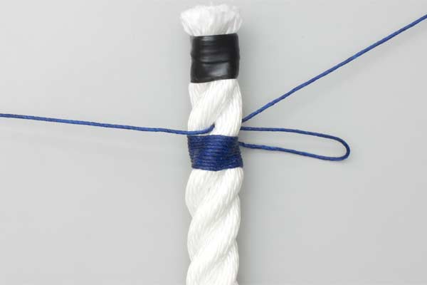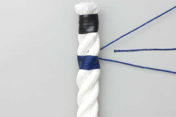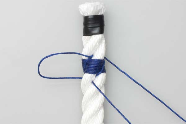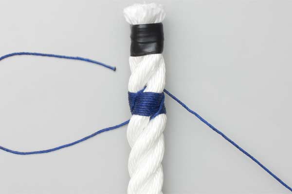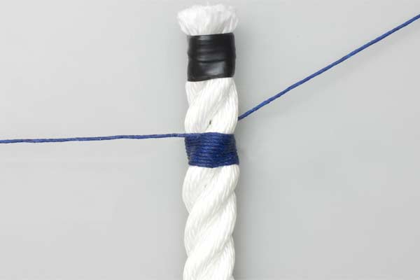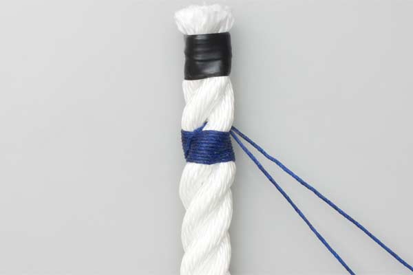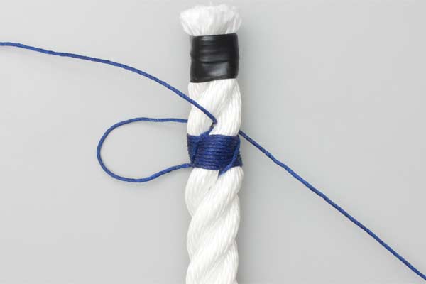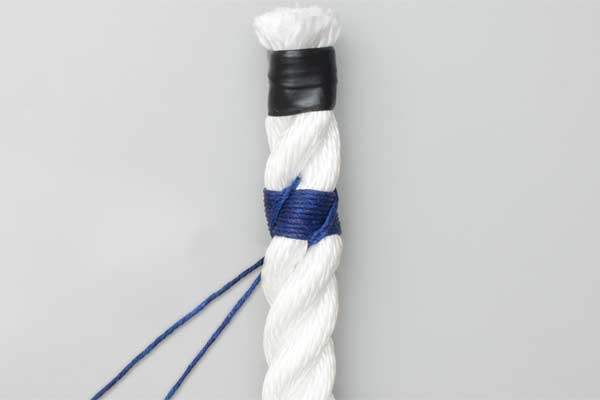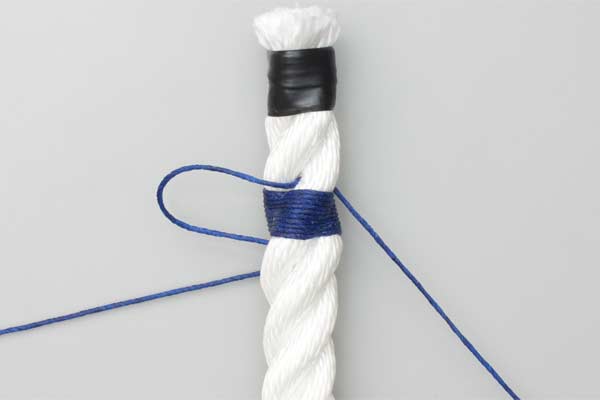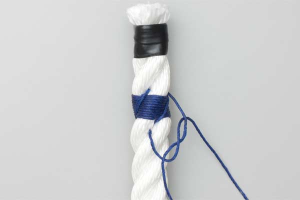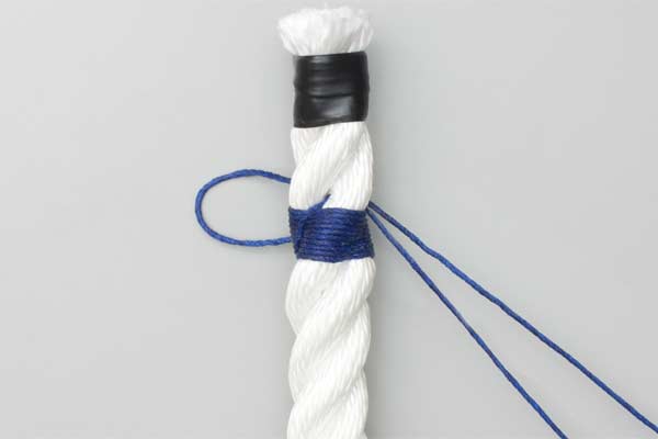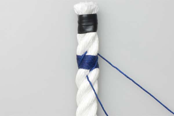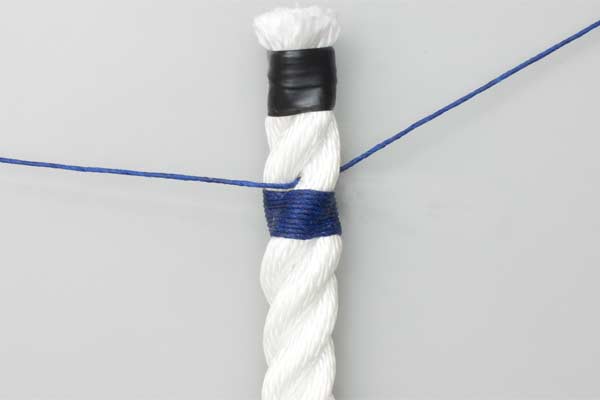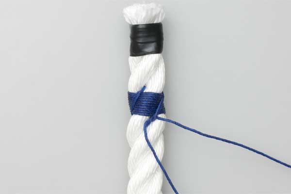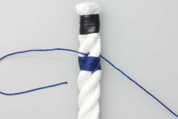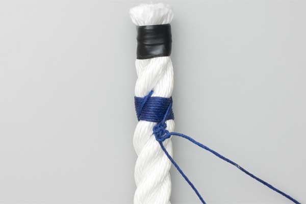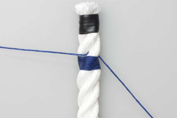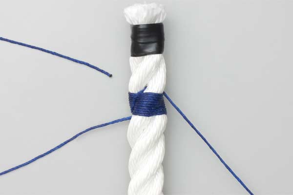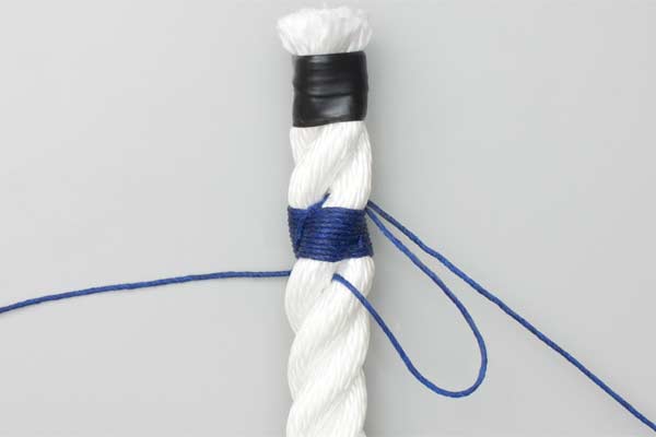 Thread the twine between the strands. Wrap the long end around the rope. Pass it under a strand, down a groove and under a strand, up a groove and under a strand. Similarly, pass the short end down, under, up, under, down and under. Tie the ends with Square (Reef) knots. Pull them through, cut short, and trim.