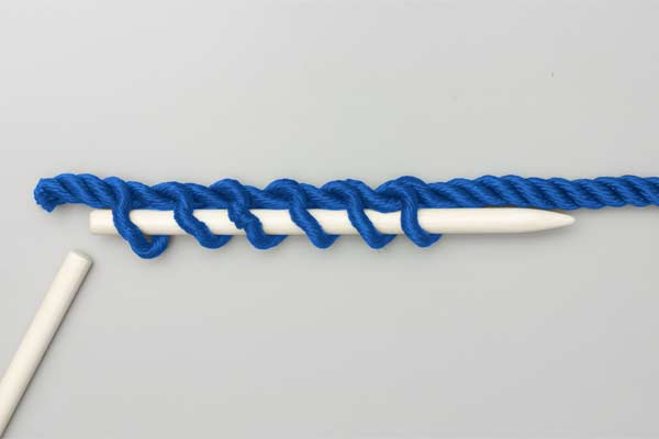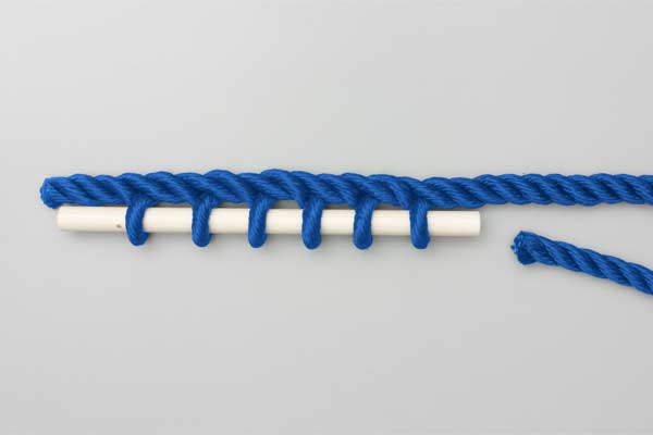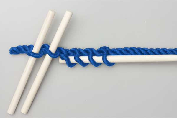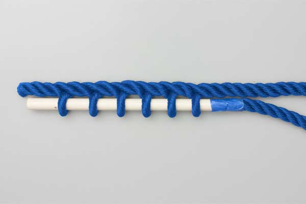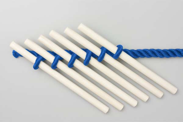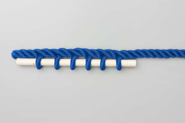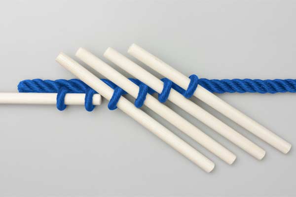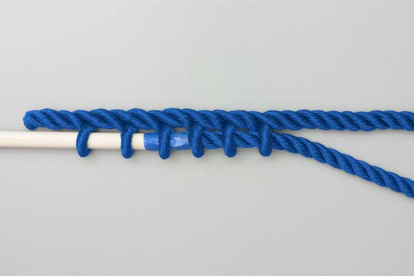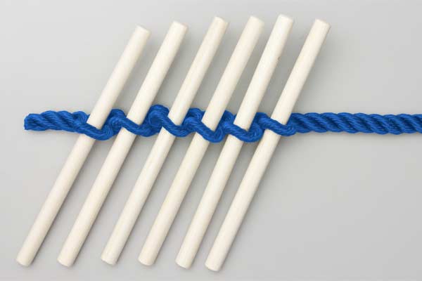 Use a rod with a tapered end to open up alternate strands. Replace this rod with six separate rods. Rotate each rod to make a larger twisted loop. Pass the rod from one end through all the loops. Attach the other end of the rope to this rod. Pull the rope through the loops to complete the knot.