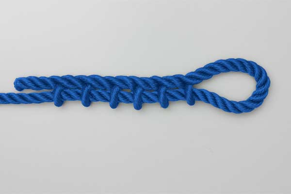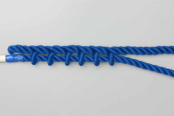 Six alternating strands are opened up using pencils or pieces of doweling rod. Each rod is rotated until a loop is formed to the side of the rope. The short rods are then replaced with one longer rod. This enables the rope to be worked until the loops are all symmetrical and the rope is restored to its normal shape. The long rod is then taped to the end of the rope so that as the rod is withdrawn, the rope follows it through the loops. Further working and stretching makes the splice grip the rope.