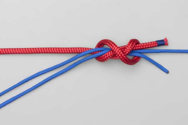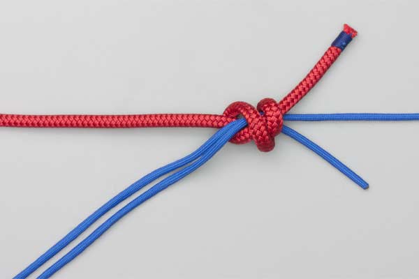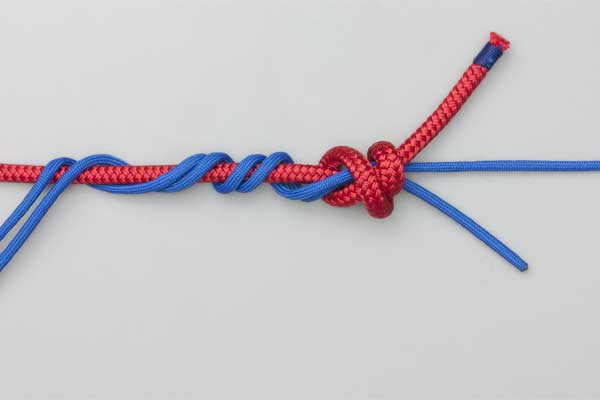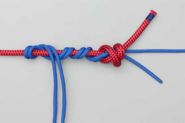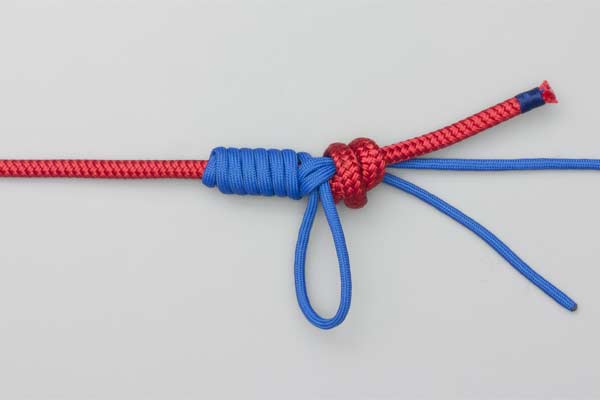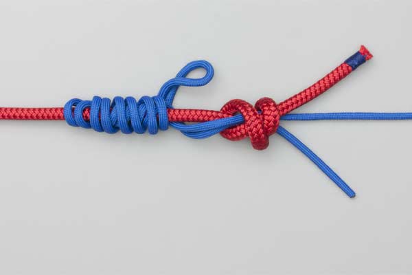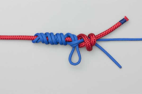 Tie a Double Overhand knot in the Tippet and tighten it form two loops. Pass a bight of the main line through the two loops. Wrap the bight four turns around the Tippet and then another four turns outside the first four turns. Tuck the bight under itself. Lubricate, pull tight, and trim the ends.
