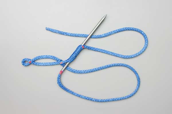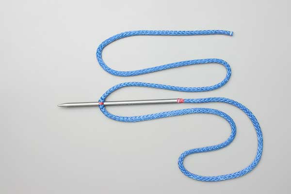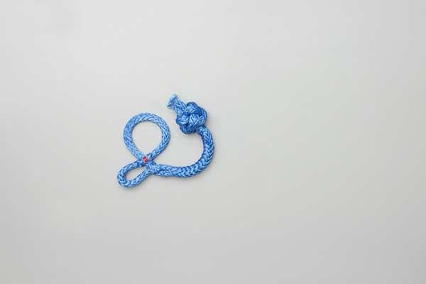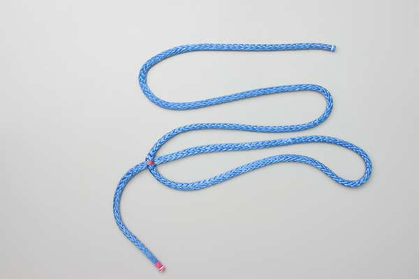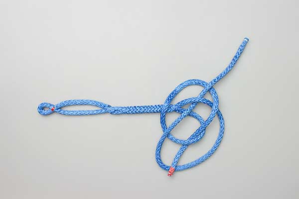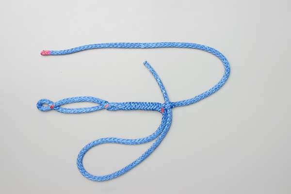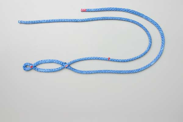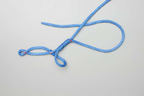 Pass one end through the center and make two marks. Pass the long end through the short at the first mark. Thread the short end along inside the long one to exit at the second mark and tighten. Pass the long end through the short. Lay out the two ends to tie the Lanyard Knot.