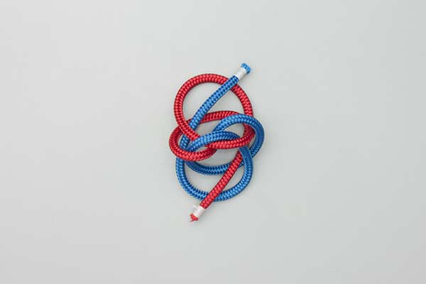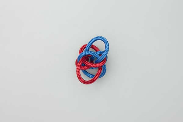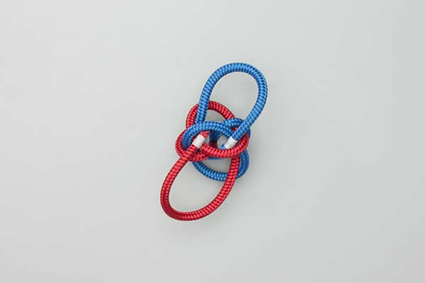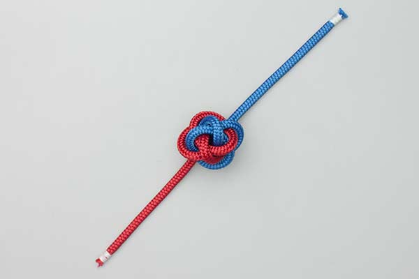 Technique: Tying this Button Knot seems to invite mistakes. The ends are easily passed through the wrong hole. (That was the reason for using two colors.) Tighten the finished Button Knot carefully. Each line is tightened from its origin in the center and then throughout the knot to the tails. Once tightened, each tail is trimmed.