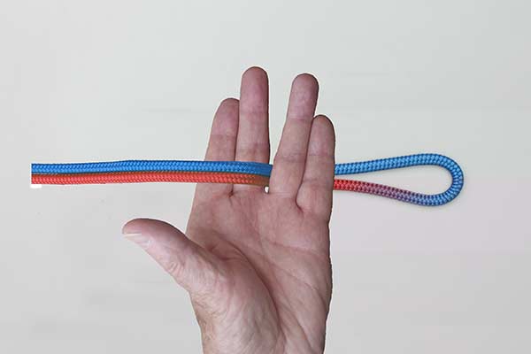 Form a loop in the middle of the rope and tie a Constrictor Knot to mark the size of the loop. Lay the ends in your hand for tying the button.