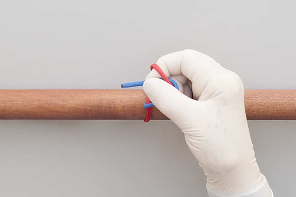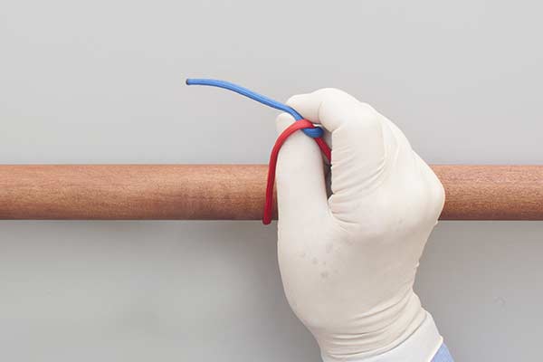 With the short end away from you, hook your index finger between the ends. Grip the end with your thumb, push it through, and pull it tight to make a Half Knot. Next, hook your thumb between the ends. Grip the end with your finger, push it through, and pull it tight to complete the Square (Reef) Knot.