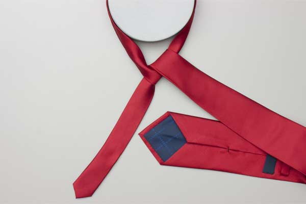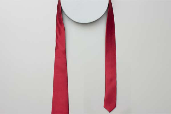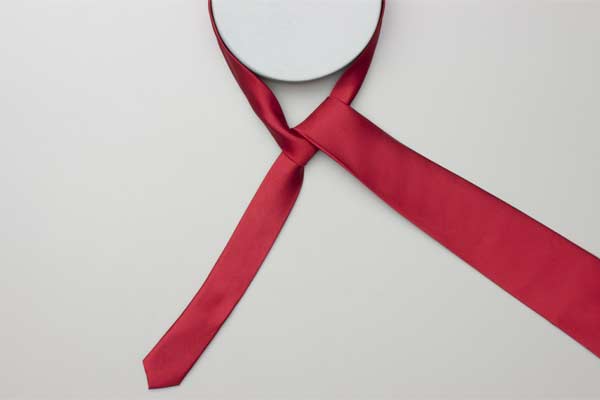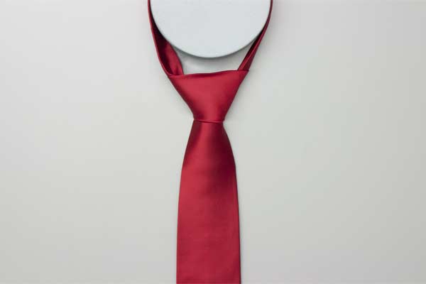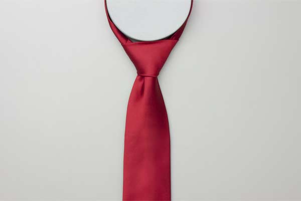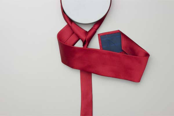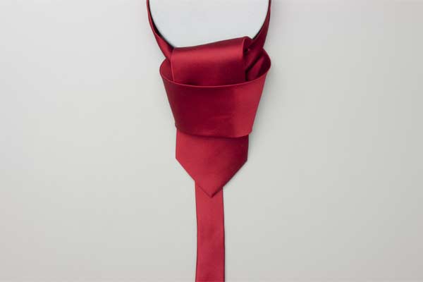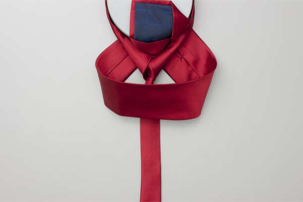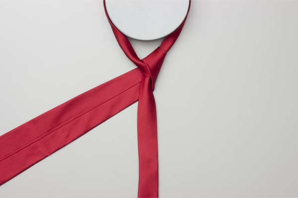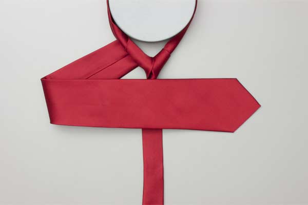 Pass the long end over and around the short end. Continue behind the short end and wrap around the opposite side. Cross in front, pull up and forward by the neck, and then down under itself. Pull the long end to tighten the knot, then the short end to make snug against the neck.
