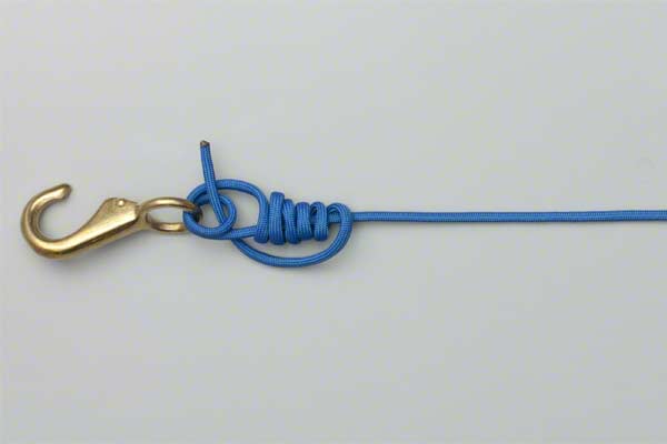 Pass the tag end of the line through the eye twice. Wrap it around the standing end five or six times. Thread the end through the original loop beside the eye. Lubricate and pull the knot tight. Trim the end, but not too short.