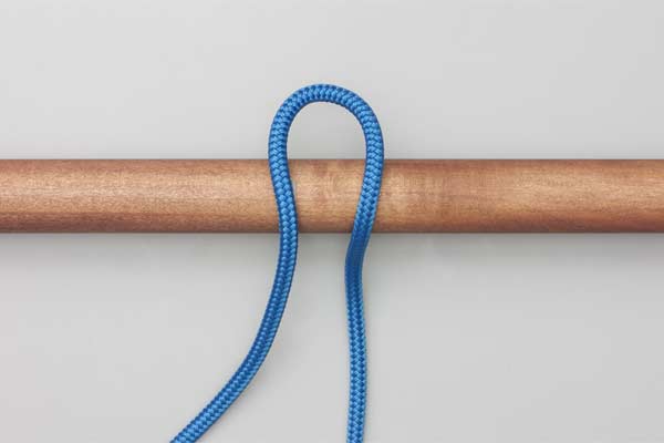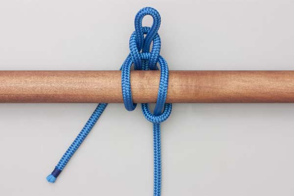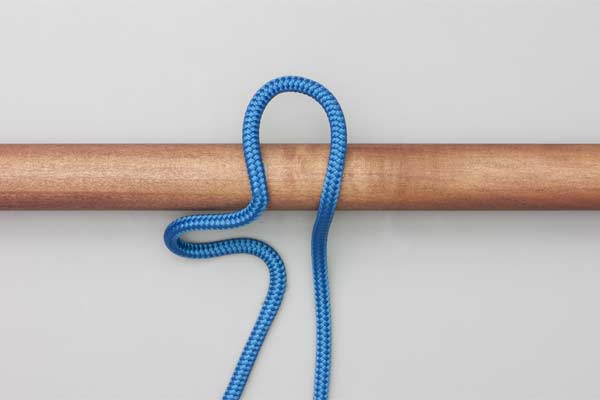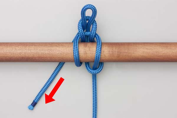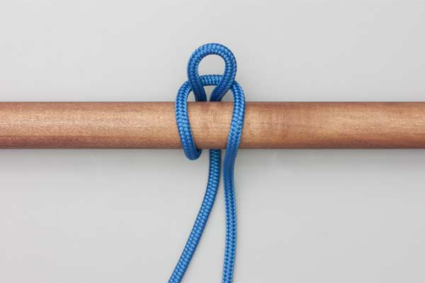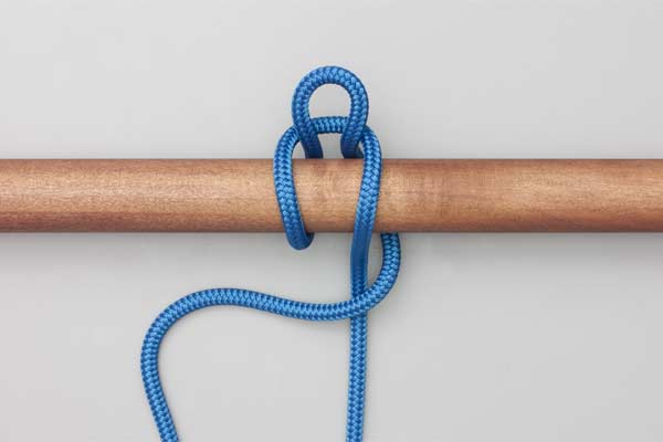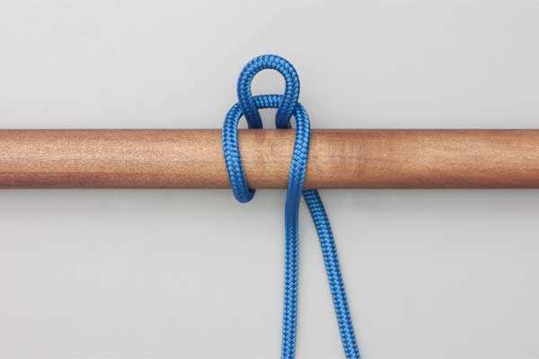 Hold an initial bight of the rope against the pole. Place a second bight behind the pole and through the initial bight. Pass the tail around the Standing End. Then tuck a bight through the second one. Tighten to secure the knot and take the load. Pull the tail to release.